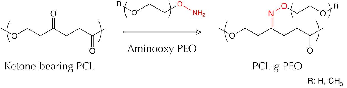 ラクトン(環状エステル)やラクチド(環状乳酸二量体)の開環重合によって得られるポリエステルの材料物性は、その一次構造によって決定され、官能基の導入による機能化(化学修飾)は一般に困難である。谷口研究室では、アミノオキシ基とケトン間の高い化学選択的反応を利用して、ポリエステル側鎖に種々の原子団を容易に導入することに成功した。これによって、分解性材料のさらなる機能化が可能になる。