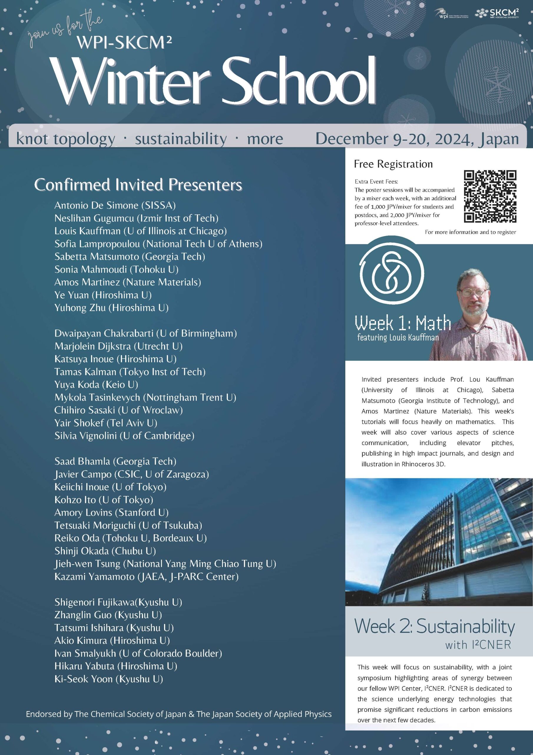 This event is part of a 2-week school, covering topics related to knot topology, chirality, and sustainability from December 9-20, 2024. Week 1 will be at Hiroshima U and week 2 will be at Kyushu U. Talks will also be available by webinar, so online participation is also warmly welcomed. For more information and registration for the entire school, please see: https://wpi-skcm2.hiroshima-u.ac.jp/conferences/2024-winter-school/