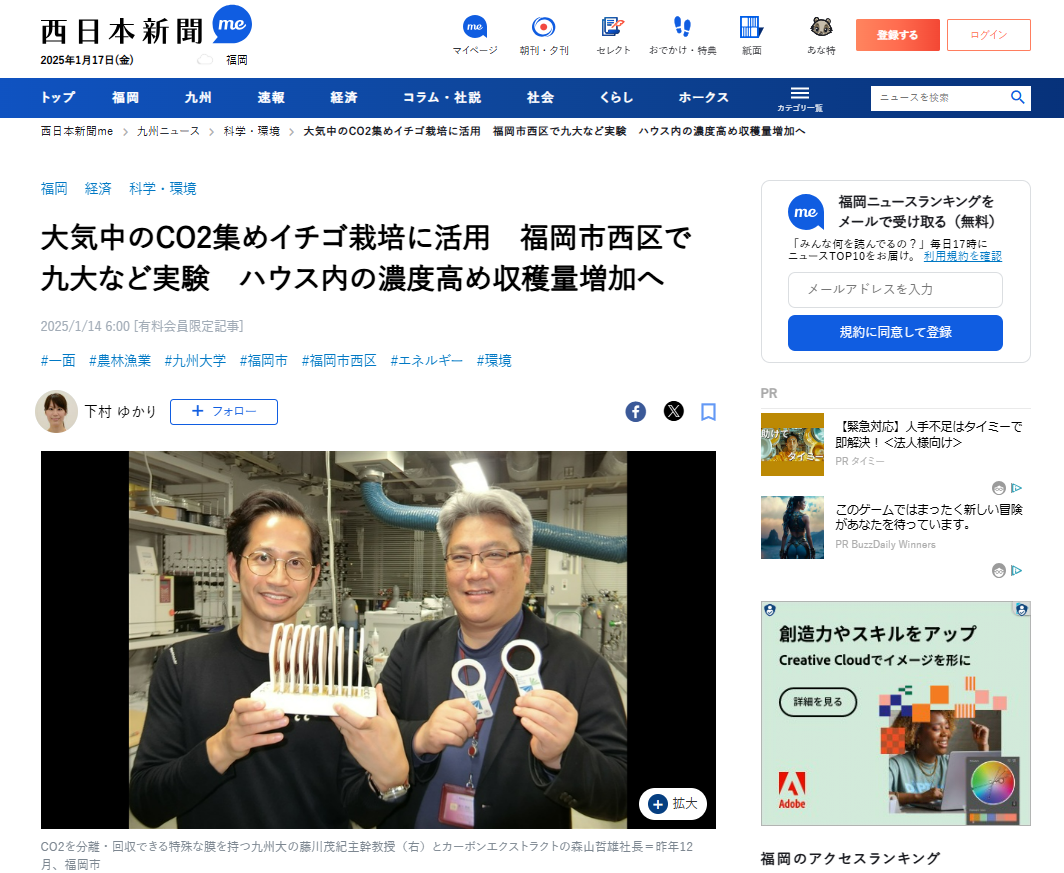 A research group led by Prof. Shigenori Fujikawa (Multiscale Science and Engineering for Energy and the Environment Thrust), in collaboration with Sojitz Corporation and other companies, has started an experiment on the implementation of separation membrane-based DAC devices for greenhouse horticulture. This has been introduced in the Japanese newspaper, Nishinippon, 14th January 2025.