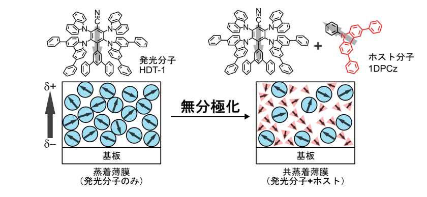 A research group led by Profs. Hajime Nakanotani and Chihaya Adachi (Advanced Energy Conversion Systems Thrust / Center for Organic Photonics and Electronics Research (OPERA)) have found that a small-sized polar host molecule that possesses both high molecular diffusivities and moderate permanent dipole moment, well cancels out the polarization formed by the SOP of the emitter molecules in the EML without a disturbance of the emitter molecules’ intrinsic orientation, leading to high-performance of OLEDs. Their molecular design strategy will allow emitter molecules to pull out the full potential of the EMLs in OLEDs.