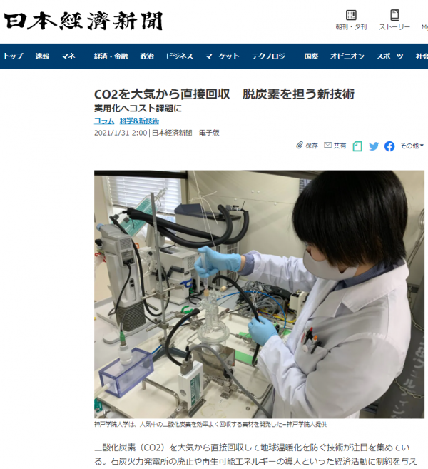Profs.Shigenori Fujikawa, Miho Yamauchi and their research team has been introduced in the Japanese newspaper, Nihon Keizai shinbun, 31st January 2021. The article is talking about that gas separation membrane systems can enable ubiquitous CO₂ removal from the atmosphere.