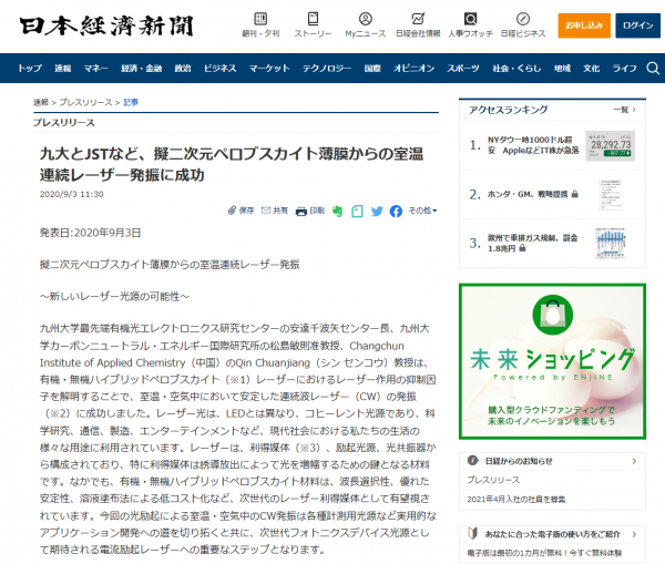 Prof. Chihaya Adachi, Assoc.Prof.Toshinori Matsushima (Advanced Energy Conversion Systems Thrust) and their research team has been introduced in the Japanese newspaper, Nihon Keizai shinbun, 3rd September 2020. The article is talking about that Continuous and stable lasing achieved from low-cost perovskites at room temperature.