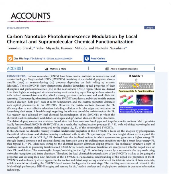 A paper by a research group of Profs. Naotoshi Nakashima(Advanced Energy Materials Thrust), and Tomohiro Shiraki(Advanced Energy Conversion Systems Thrust) has been published as a selected paper in the science journal “Accounts of Chemical Research“