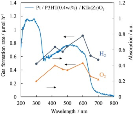 Most of the components of sunlight are visible light and near-infrared/infrared light, and there is a need for methods to efficiently utilize these components. Since the energy gap of organic semiconductors can be easily adjusted, it is possible to develop materials tailored to the photochemical reaction potential in the visible to near-infrared region. We are researching the interface chemistry of organic-inorganic semiconductors, such stabilization, and formation of charge separation states between interfaces created by developing targeted organic semiconductors and combining them with inorganic semiconductors. Using organic/inorganic semiconductor composite photocatalysts, we are developing water splitting, hydrogen peroxide synthesis, carbon dioxide reduction, or photoelectrochemical reactions.
