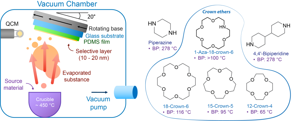 In this research, I focus on the physical vapor deposition of small molecules onto the polydimethylsiloxane (PDMS) surface to enhance the selectivity of CO₂/N₂ gas separation. The idea is that specific small molecules with chosen functional groups will provide a suitable CO₂ affinity to improve the CO₂ gas transport through the membrane. Using physical vapor deposition is a novel approach in this direction. The deposition from the vapor phase enables the uniform coating of the membrane surface with precise nanoscale thickness control. It also prevents negative effects that occur when exposing the polymer to organic solvents during wet chemistry approaches.