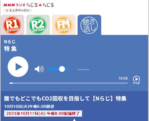 藤川教授がNHKラジオ「Nらじ」に出演しました 2023.10.12 お知らせアウトリーチ シェアする: 藤川茂紀教授( マルチスケール構造科学ユニット)が、NHKラジオ番組「Nらじ」の特集「誰でもどこでもCO₂回収を目指して」に出演しました。 放送:10月10日(火)18:00~ ※放送終了後に、1週間のオンデマンド配信 関連リンク NHKラジオ番組「Nらじ」