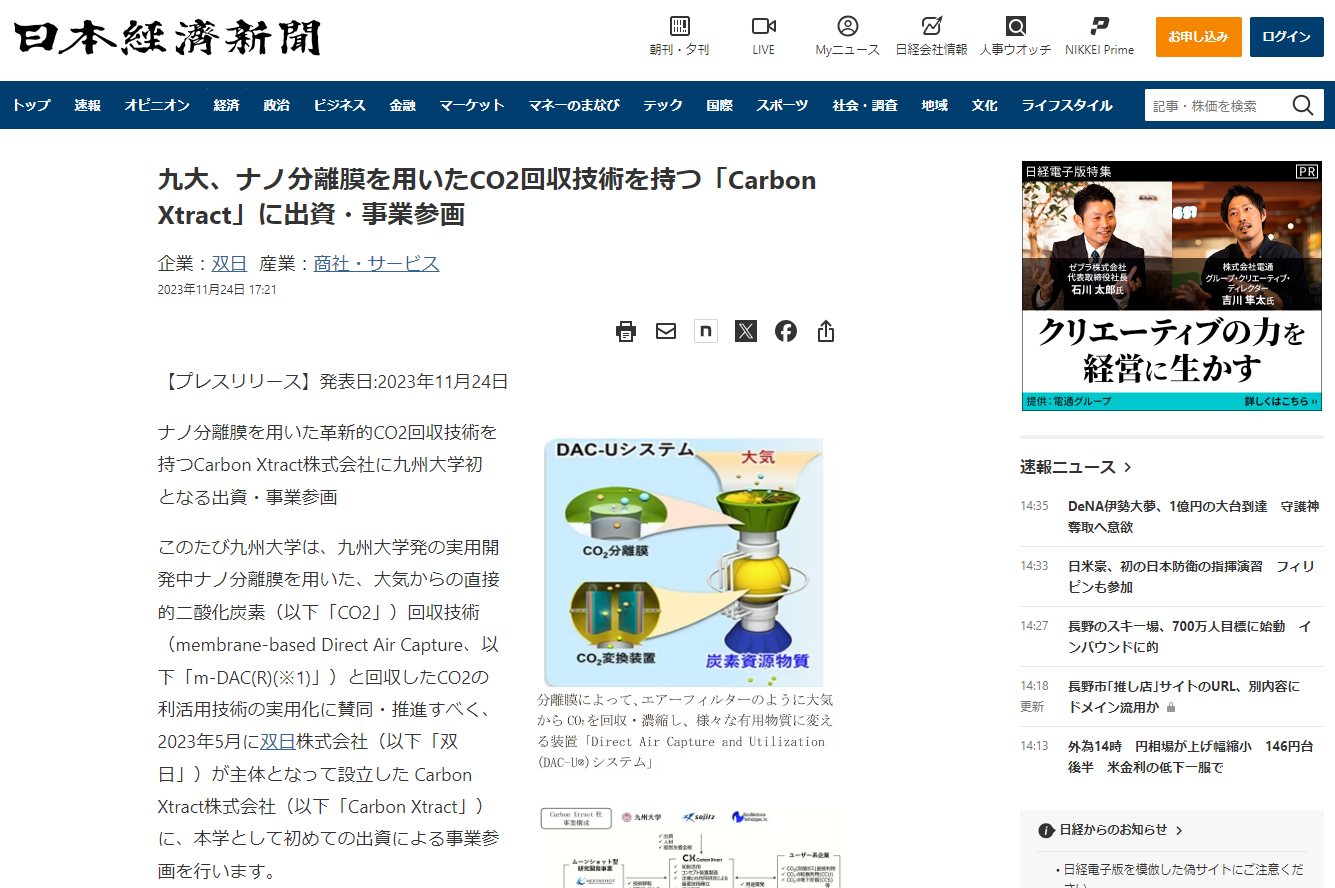 日本経済新聞HP「九大、ナノ分離膜を用いたCO2回収技術を持つ「Carbon Xtract」に出資・事業参画」