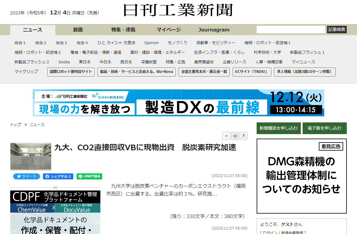 日刊工業新聞HP「九大、CO2直接回収VBに現物出資 脱炭素研究加速」