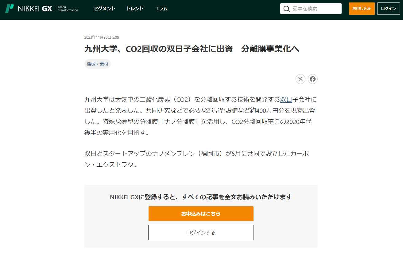 NIKKEI GX HP「九州大学、CO2回収の双日子会社に出資 分離膜事業化へ」