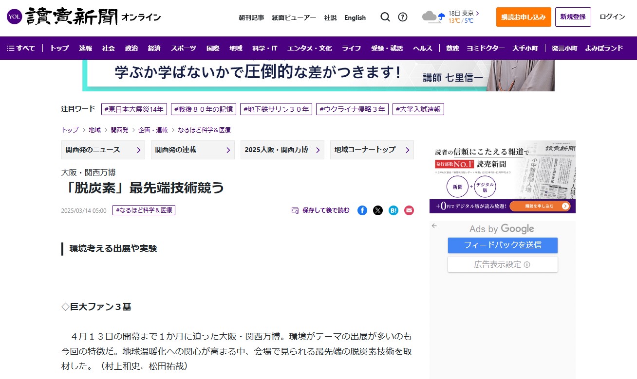 【新聞掲載】2025年日本国際博覧会(大阪・関西万博)への出展について、読売新聞等に掲載されました