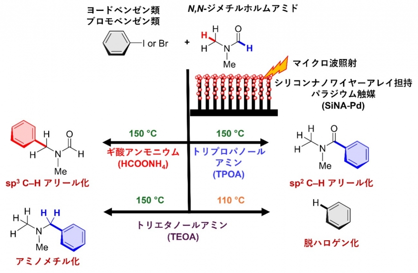 反応の切替えは、添加剤(アミン類:窒素を持つ化合物)や反応温度といったごく小さな条件変更のみで達成されました。触媒にはシリコンナノワイヤーアレイ(SiNA)にパラジウム(Pd)を固定化したSiNA-Pdを用い、触媒量はわずか65mol ppm(原料1molに対して65ppm、0.0065mol%)でしたが、反応物の高い収率と触媒の再利用性を示し、金属残渣も医薬品基準を満たしました。