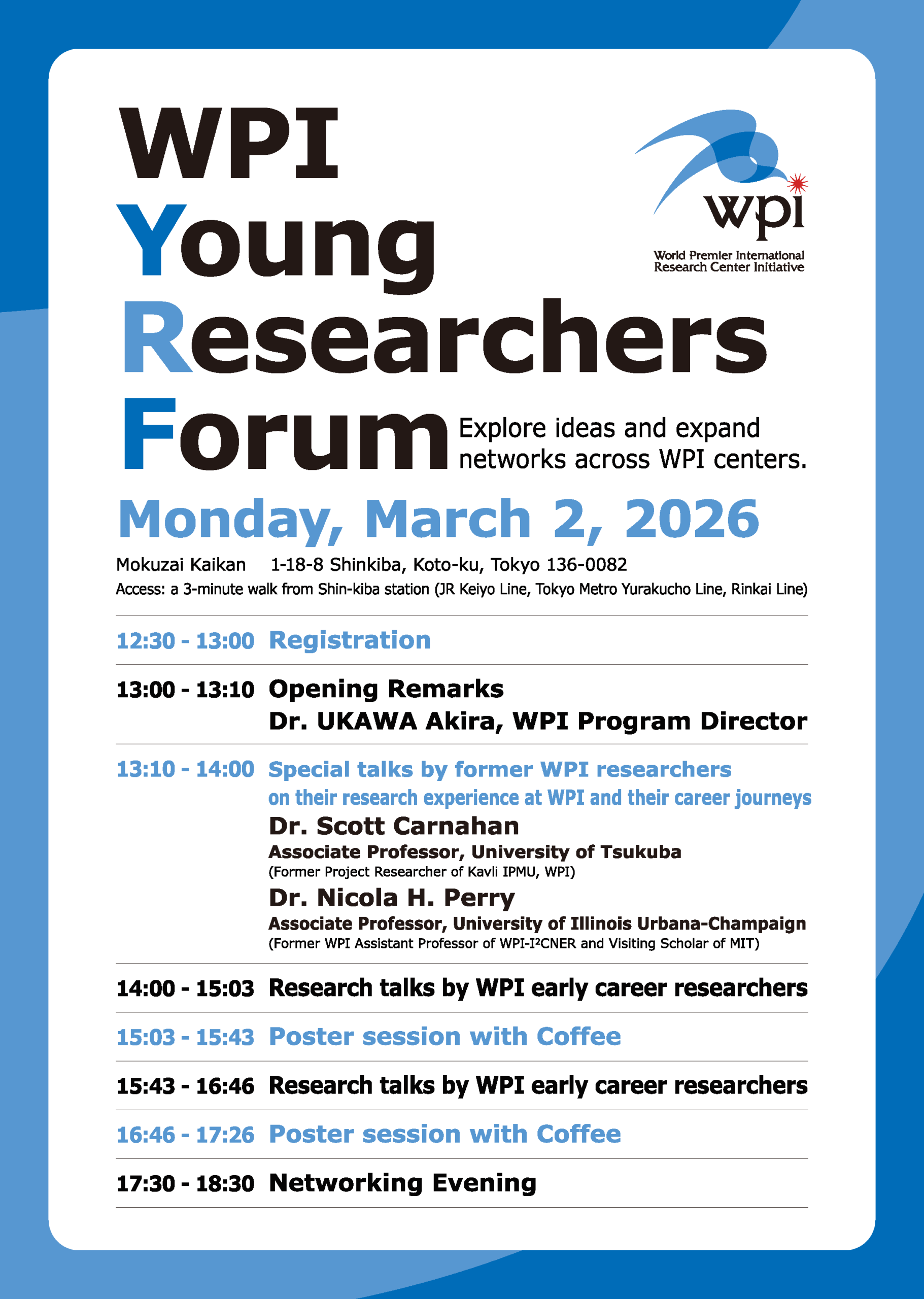 2026年3月2日(月)に木材会館(東京都江東区)で開催されたWPI Young Researchers Forumに、各WPI拠点の若手研究者が集まり、講演やグループディスカッション、ポスター発表を通して互いに交流を深め、自身の将来のキャリアパスについて考えを深めました。