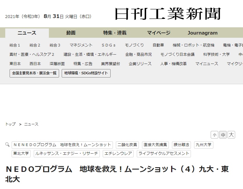 詳しくは日刊工業新聞(電子版)「NEDOプログラム 地球を救え!ムーンショット(4)九大・東北大」をご覧ください。(無料会員に登録すると月11本まで記事が読めます)