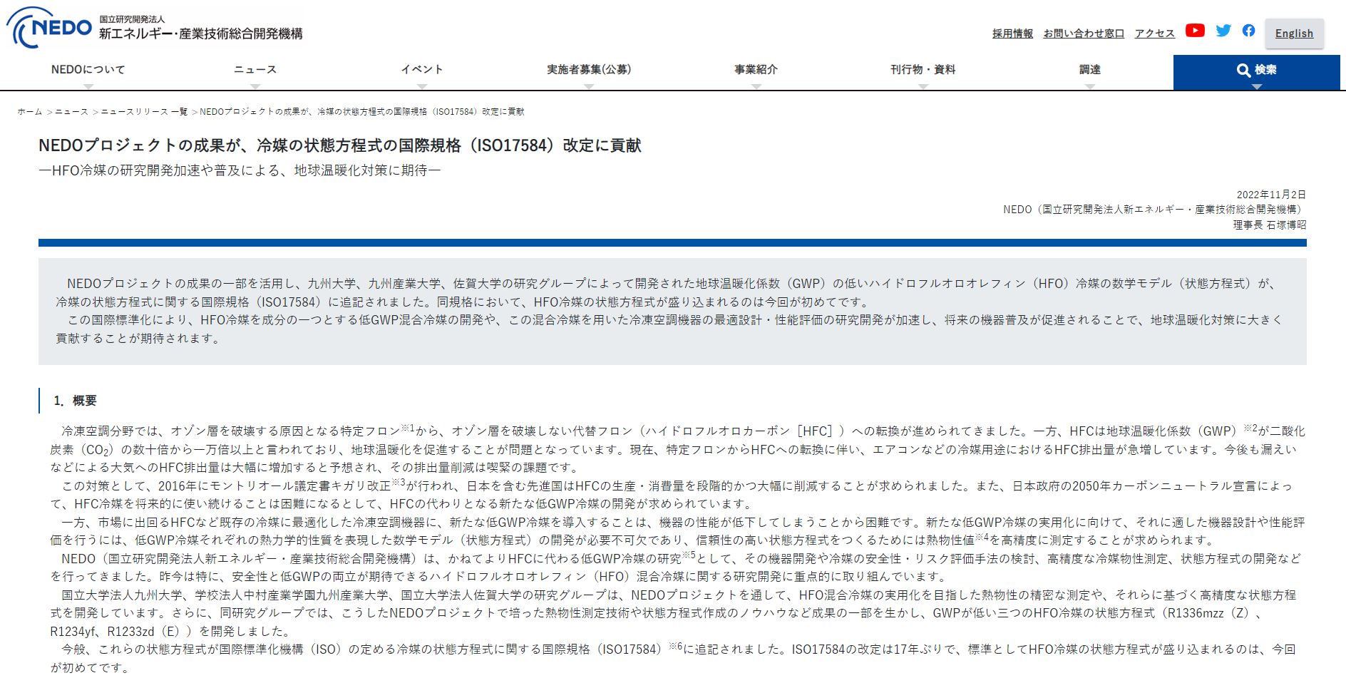 NEDOプロジェクトの成果の一部を活用し、九州大学、九州産業大学、佐賀大学の研究グループによって開発された地球温暖化係数(GWP)の低いハイドロフルオロオレフィン(HFO)冷媒の数学モデル(状態方程式)が、冷媒の状態方程式に関する国際規格(ISO17584)に追記されました。同規格において、HFO冷媒の状態方程式が盛り込まれるのは今回が初めてです。