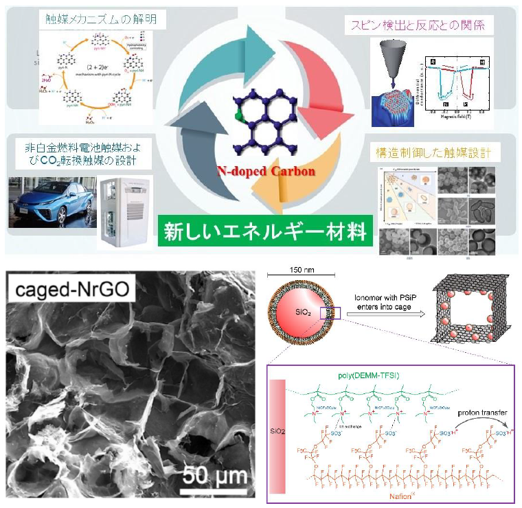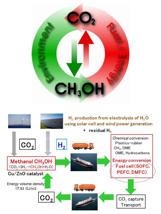 電気変換CO₂分離水素エネルギー二酸化炭素(CO₂) 触媒、メタノール合成、燃料電池電極触媒 中村 潤児 特任教授 研究ユニット:物質変換科学ユニット E-mail: Website:https://hyoka.ofc.kyushu-u.ac.jp/search/details/K008224/index.html 研究概要 CO₂からのメタノール合成 Cu/ZnO系触媒によるメタノール合成の活性点および反応機構を解明してきた(Nature Chemistry,2019)。触媒システム構築のコンサルタントが可能。カーボンニュートラルを達成する現実的な方法論を提案している。それは図に示すようなメタノール社会である。カーボンニュートラル対策の具体的方策と定量的情報を提供することが可能である。 非白金系燃料電池カーボン触媒 エネルギー用触媒には金属触媒は向かずカーボン触媒開発が必須。酸素還元に対する窒素ドープカーボン触媒の活性点を解明した(Science, 2016)。また、世界最高レベルの高活性触媒を開発した。活性触媒の要件は疎水性とプロトン伝導性の両立である。開発触媒では、以下の図のように疎水性の籠状グラフェン触媒の細孔内にプロトン伝導性の物質を導入した。 混成電位駆動型触媒反応(新規触媒メカニズム) 外部からのエネルギー供給をせずに反応の自由エネルギー落差を過電圧に変換して高難易反応を進行させることが可能。外部から電位をかけなくてもCO₂からエタノールを合成することが可能である。