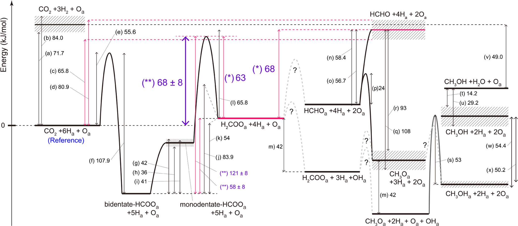 今後、本研究結果に基づいて、フォーメート(HCOO)からジオキシメチレン(H2COO)への水素化過程を加速する触媒や反応システムを構築することで、CO2の水素化によるメタノール合成を低温化し、転換効率を高めることを目指します。