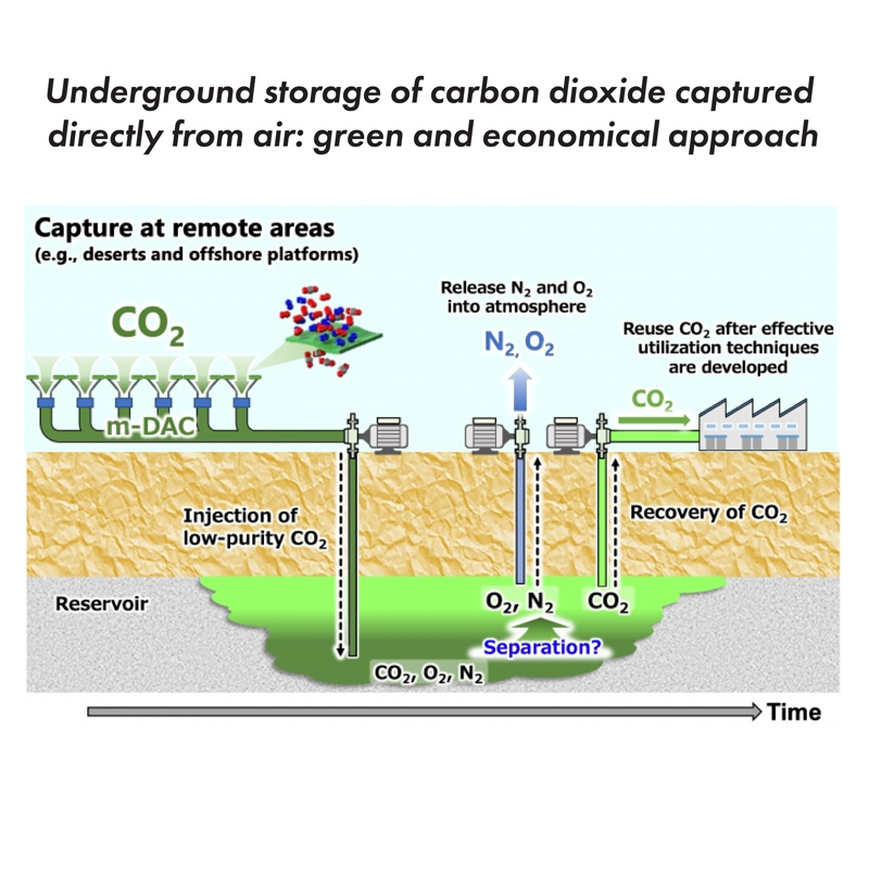 Carbon capture and storage has been considered as a realistic approach to reducing atmospheric CO2 concentrations. However, the cost of capturing high-purity CO2 typically used for geological storage (e.g., 98%) is high. Direct air capture (DAC), a technology that extracts CO2 of relatively low-purity from the ambient atmosphere, has been recently proposed as a means to achieve negative CO2 emissions when the product is sequestered underground. Although the CO2 produced by DAC is of low-purity, the other gaseous components (mainly nitrogen and oxygen) are not hazardous materials like NOx and SOx that must be typically dealt with by conventional projects in coal-burning plants. Here, we evaluate geological storage of the low-purity CO2 captured via advanced membrane-based DAC technology. The ubiquity of ambient air is important in reducing transport costs and ensuring social acceptance as the CO2 product can be both produced and stored at sites in remote areas, such as deserts and offshore platforms. We calculated the density of CO2–N2–O2 mixtures via molecular dynamics simulation and evaluated the cost of the low-purity CO2 storage. Our evaluation suggests that the storage of low-purity CO2 in geological formations is environmentally acceptable and economically viable.