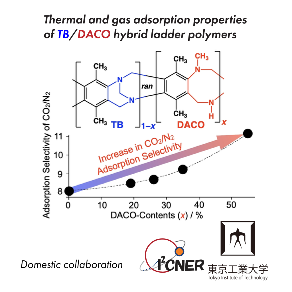 A polymer of intrinsic microporosity (PIM) consisting of Tröger’s base (TB) undergoes ring opening of the bicyclic amine upon N-methylation followed by alkaline hydrolysis, resulting in a hybrid ladder polymer that contains diazacyclooctane (DACO) units with tert- and sec-amino groups. The hybrid ladder polymers with various TB/DACO ratios can be prepared depending on the reaction conditions. Here we report a systematic study on the effect of DACO content on the thermal and gas adsorption properties of the hybrid ladder polymer. Using a PIM derived from 2,5-diamino-p-xylene, we prepared hybrid ladder polymers with a DACO content ranging from 19% to 55% while having a similar molecular weight. The thermal stability of the hybrid ladder polymers, evaluated by thermogravimetric analysis, is decreased with the increase in DACO content. Based on gas adsorption measurements, the increase in DACO content results in the decrease in the BET surface area but improves the gas adsorption selectivity for CO2 against N2, likely due to high basicity of the sec-amino group of DACO unit. This result demonstrates that the partial TB-to-DACO conversion of the TB-based PIM may provide a simple but useful strategy to design polymer materials that enable selective CO2 capture and/or separation.