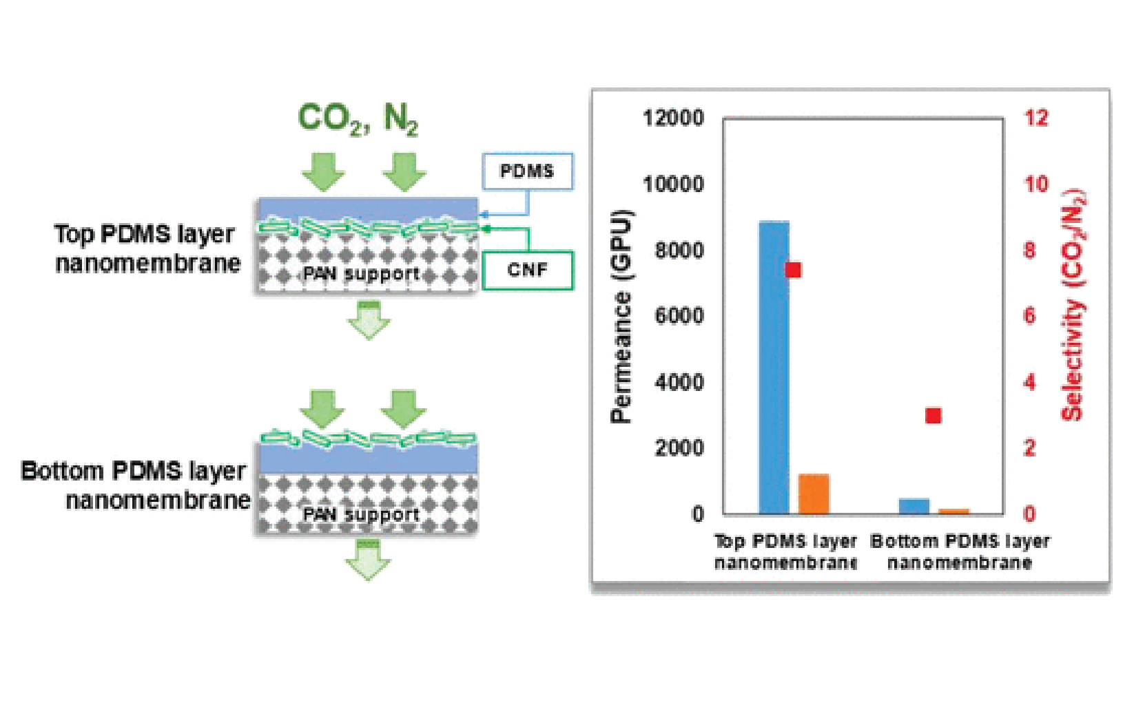 Robust, nanometer-thick, permselective membranes were developed by composite formation from poly(dimethylsiloxane) (PDMS) and cellulose nanofibers (CNF). Their unique behavior is discussed in relation to that of a single-component PDMS nanomembrane. In the absence of the CNF component, the PDMS nanomembrane with a thickness of 34 nm displays ultrahigh permeability of CO2 gas, which is only ca. one order of magnitude smaller than that of free-flowing gases through a porous poly(acrylonitrile) support film (PAN, thickness 150 μm). The constant CO2/N2 selectivity observed for the whole range of membrane thickness (34 nm–10 μm) suggests that in the single-component membrane, the kinetic process at the membrane surface determines the permselective behavior. Multilayered composite membranes are obtainable by repeated spin coating. The mechanical weakness of the single-component PDMS membrane is improved by complexation with CNF, as confirmed by the bulge test and the ease of macroscopic handling. Such a robust PDMS–CNF nanomembrane gives superior permeation of 50,000 GPU with a defect-free PDMS layer of ca. 17 nm thickness. Interestingly, the permeation characteristics of the composite membrane are strongly affected by the asymmetric arrangement of PDMS and CNF layers, and the gas permeation from the side of the CNF layer is drastically reduced. The PDMS composite membrane is expected to provide practically useful systems as a means of direct air capture.