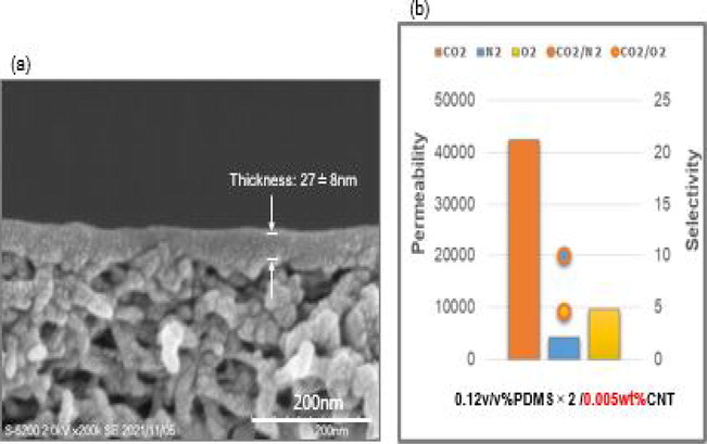 Toward CO2 capture from air, highly-permeable nanomembranes of poly(dimethylsiloxane) (PDMS) were mechanically reinforced by thin layers of carbon nanotube (CNT), giving CO2 permeability and gas selectivity of 42,500 GPU and 10 (CO2/N2), respectively in the case of the 27-nm-thick, composite membrane.
