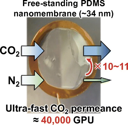 Fabrication and gas permselective behavior of free-standing polydimethylsiloxane (PDMS) nanomembranes is discussed. The largest CO2 permeance is close to 40,000 GPU (the highest one ever reported) at 34-nm membrane thickness without losing the CO2/N2 selectivity of 10–12, indicating the formation of pin-hole free nanomembranes.