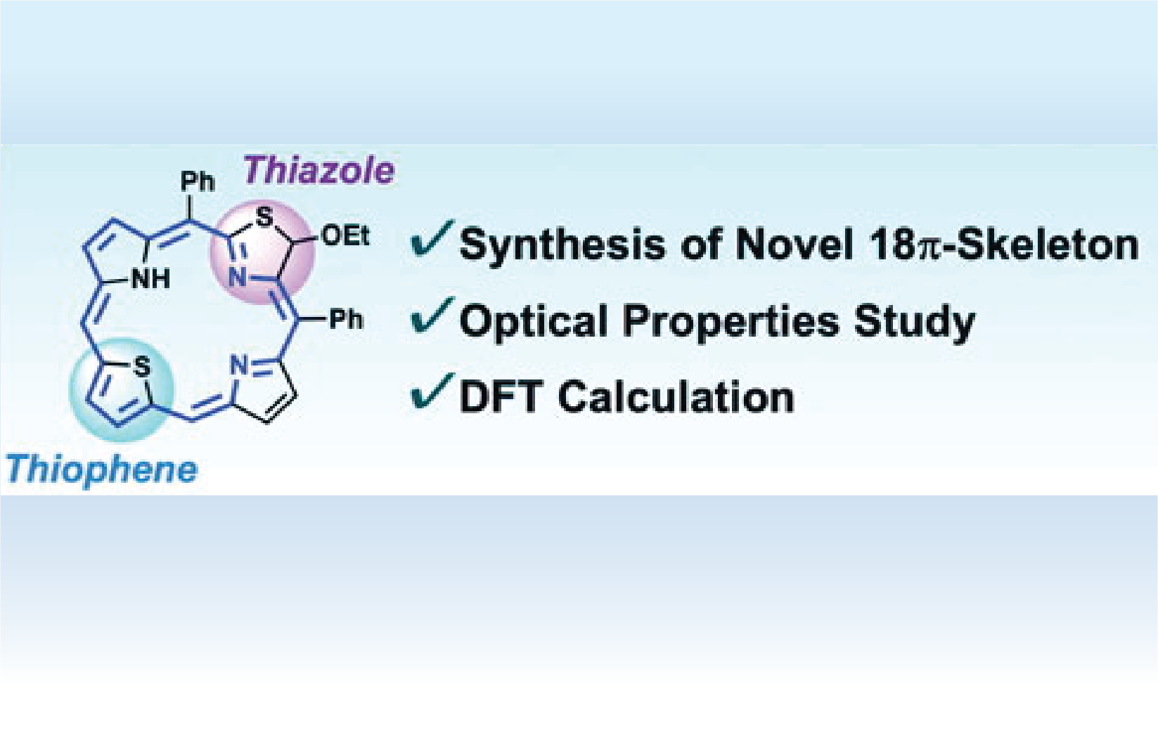 A novel macrocyclic 𝜋π-skeleton 1 containing thiazole and thiophene rings was synthesized via MacDonald [3+1]-type condensation, and its optical properties were investigated. Two sulfur atoms were effective for the bathochromic shift of the ultraviolet-visible absorption bands in comparison with the traditional porphyrin and chlorin compounds. The characteristics of the absorption spectrum and the nucleus-independent chemical shift calculations show that the 𝜋π-skeleton 1 is the chlorin-type compound.