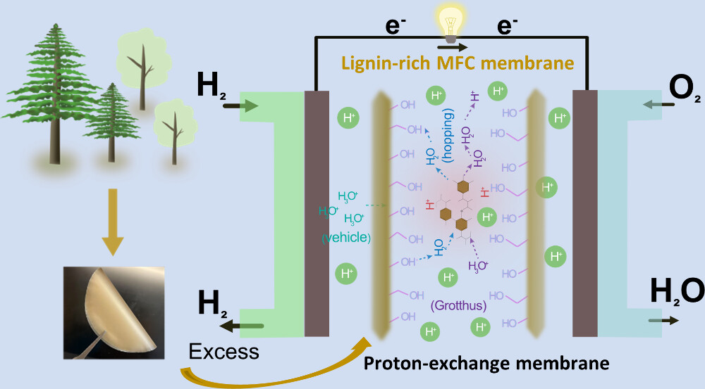 Biobased alternatives to synthetic perfluorinated proton exchange membranes (PEMs) are needed to advance sustainable energy systems. This study evaluates lignin-containing microfibrillated cellulose (LMFC) as a material for PEMs. We produced LMFC from unbleached softwood and hardwood kraft pulps containing 11% and 14% klason lignin, respectively. Compared to lignin-free microfibrillated cellulose (MFC) membrane, LMFC membranes showed enhanced mechanical properties and proton conductivity due to its retained lignin content. The presence of carboxyl groups in LMFC led to doubled proton conductivity versus MFC under varied temperatures and high humidity conditions. While conventional PEMs show significant conductivity loss above 80 °C due to dehydration, both MFC and LMFC membranes demonstrated increasing proton conductivity at temperatures up to 120 °C under high humidity conditions. LMFC membranes exhibited tensile strength above 220 MPa with Young’s modulus exceeding 12 GPa. Gas transport tests revealed high selectivity for H2/N2 and H2/O2 pairs in LMFC and MFC membranes (α(H2/N2) ≈ 210), essential for preventing fuel loss in practical PEM applications. The achieved property ranges convincingly demonstrate LMFC’s potential as a sustainable alternative to conventional PEM materials.